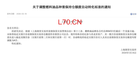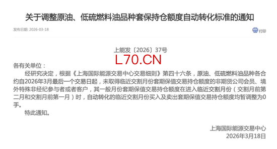 为保证期货市场稳定运行,3月18日收盘后,上海期货交易所(下称上期所)及上海国际能源中心(下称上期能源)发布公告调整燃料油、原油、低硫燃料油品种套保持仓额度自动转化标准。公告称,自2026年3月最后一个交易日起,燃料油、原油、低硫燃料油品种各合约未取得临近交割月份套期保值交易持仓额度的非期货公司会员、境外特殊非经纪参与者或者客户,其一般月份套期保值交易持仓额度在进入临近交割月份(交割月前第二月和交割月前第一月)时,自动转化的临近交割月份买入及卖出套期保值交易持仓额度均暂调整为0手。