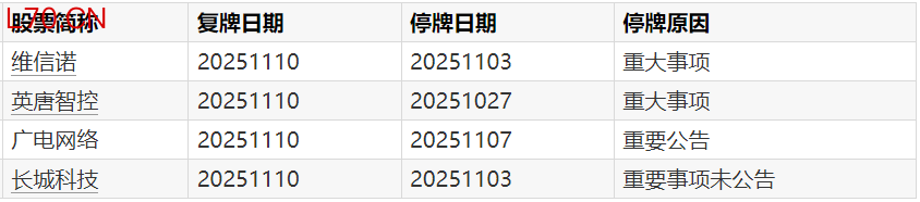 A股复牌提示:4股今日复牌