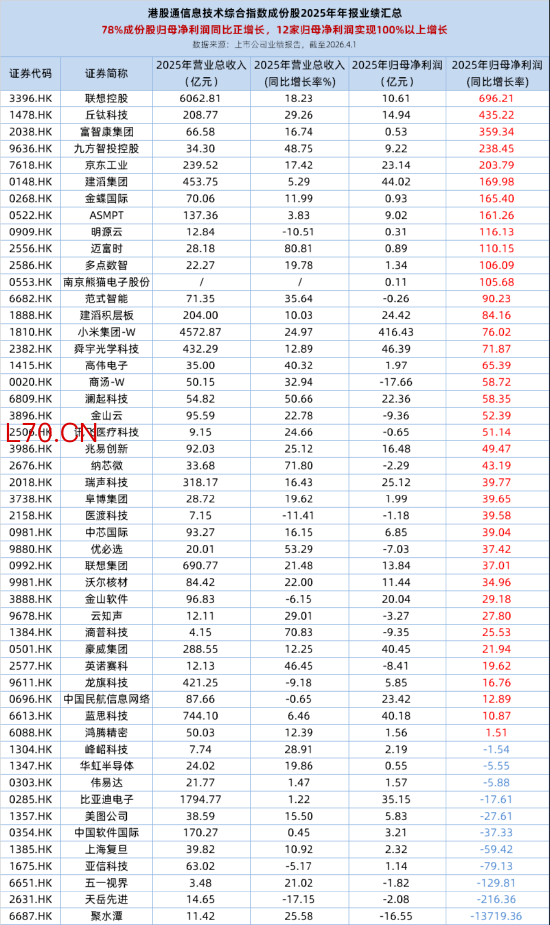 伴随AI算力需求爆发,港股硬科技板块2025年交出了亮眼的成绩单。截至4月1日,中证港股通信息技术综合指数50只成份股已全部披露2025年年报业绩。据统计,50只成份股中有39家实现归母净利润同比正增长,其中12家更是实现100%以上翻倍增长。联想控股2025年归母净利润10.61亿元,同比高增696%;丘钛科技2025年归母净利润14.94亿元,同比高增435%;小米集团-W狂揽416亿元净利润,同比大增76%!