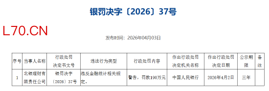 北银理财被罚190万元:违反金融统计相关规定