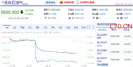 快讯:液化气主力合约触及跌停,跌幅14.00%