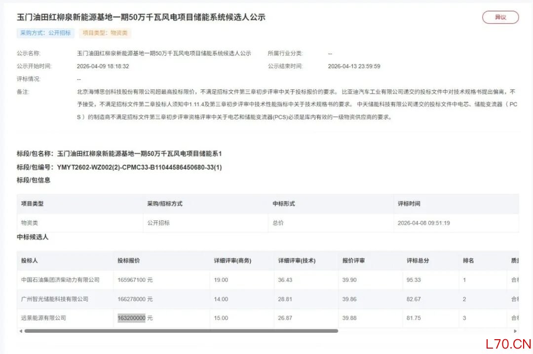 北极星储能网讯:2026年4月9日,甘肃玉门油田红柳泉新能源基地一期50万千瓦风电项目储能系统采购中标候选人公示,前三名中标候选人依次为中国石油集团济柴动力有限公司、广州智光储能科技有限公司、远景能源有限公司。