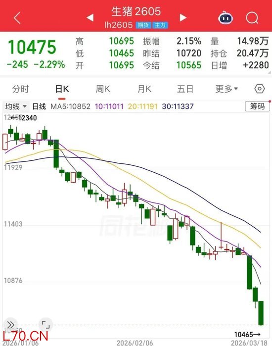 元股证券:ygzq.hk今年以来,生猪期货价格持续下跌,本周更是“三连阴”,主力合约从年初的高点12340元/吨,跌至目前的10465元/吨,累计跌幅超过15%。现货市场上,多地猪价已跌破10元/公斤关口,全行业陷入亏损状态。