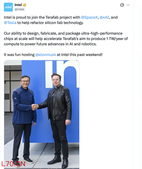 英特尔官方账号随即写道:“我们很自豪地加入Terafab项目,与SpaceX、xAI、特斯拉携手,共同重构芯片制造技术。”英特尔首席执行官陈立武补充表示:“马斯克有着颠覆整个行业的成功记录,这正是今天半导体制造业所需要的。Terafab代表着逻辑芯片、内存和封装制造方式的范式转变。”这条帖子在芯片产业引发的震动,丝毫不亚于一个月前的Terafab发布会。英特尔股价当日上涨超过4%。