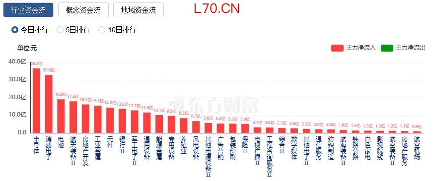 行业资金方面,截至收盘,半导体、消费电子、电池等净流入排名靠前,其中半导体净流入36.41亿。