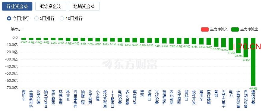 净流出方面,通信设备、自动化设备、计算机设备等净流出排名靠前,其中通信设备净流出66.89亿元。
