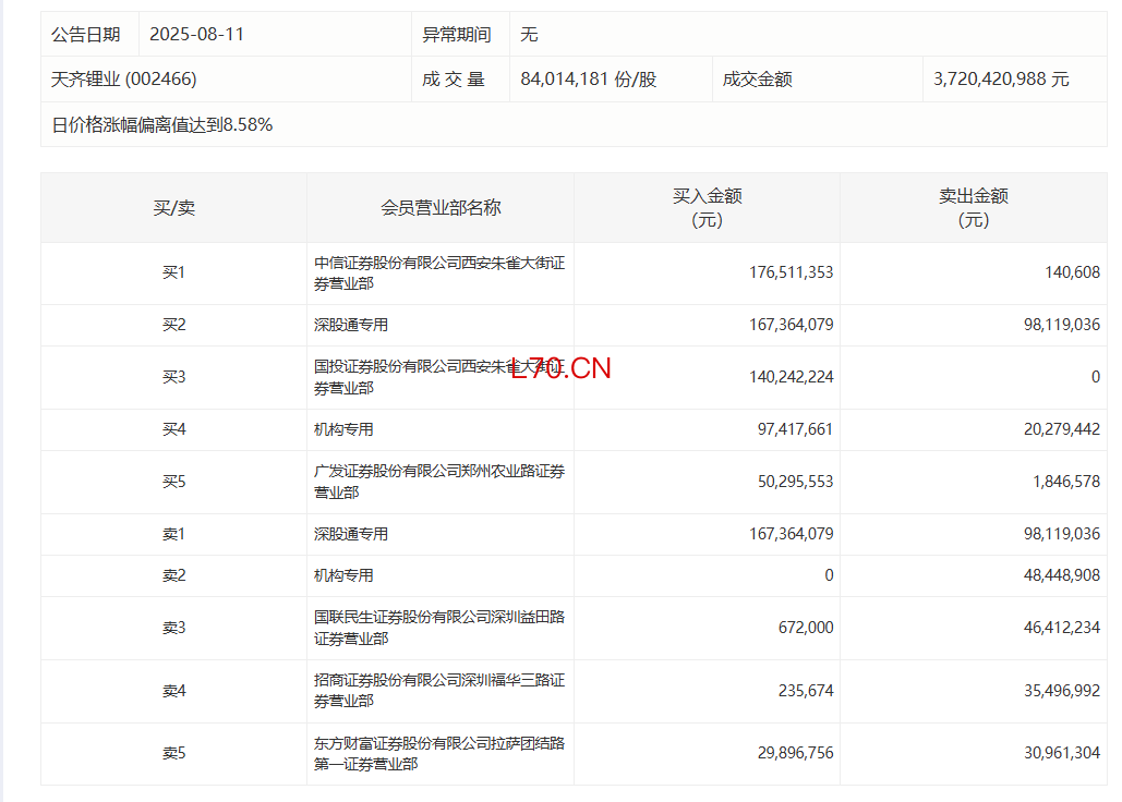 天齐锂业今日涨停 深股通净买入6924.50万元